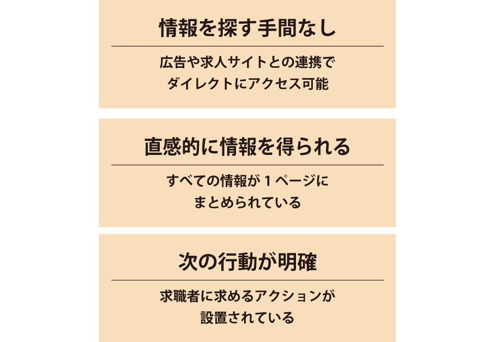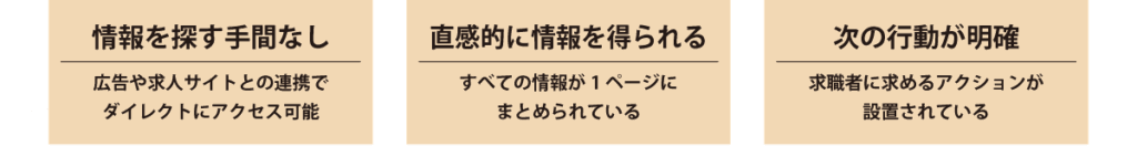 求職者が求める情報を、1ページで完結する構成なので、不必要なページにアクセスすることなく、ダイレクトに、情報をお届けできるのが強み!